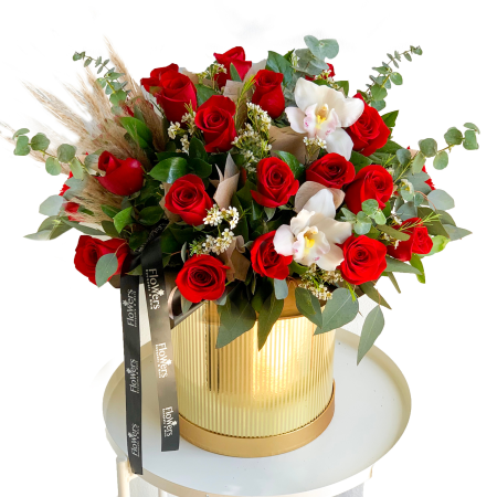 The "Romantic Garden" arrangement is a breathtaking display of love and elegance. This stunning bouquet features a mix of luxurious red roses, delicate white orchids, and soft greenery like eucalyptus and fragrant flowers. The golden, ribbed vase adds a touch of glamour, enhancing the bouquet’s natural beauty. Perfect for special occasions, anniversaries, or simply expressing affection, this sophisticated yet romantic bouquet brings nature’s finest together in one unforgettable gift.