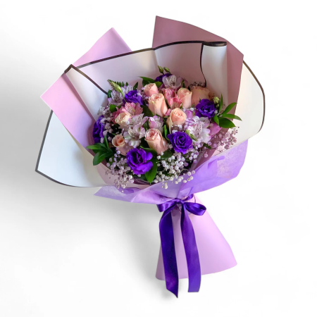 icate and elegant, Morning Melody is a stunning bouquet that brings together soft blush pink roses, rich purple lisianthus, and white alstroemeria, delicately accented with baby's breath and lush greenery. Wrapped in layered pastel lilac and white paper with a deep violet satin ribbon, this bouquet evokes a sense of calm, romance, and fresh morning charm—perfect for expressing admiration, love, or thoughtful appreciation. Ideal for birthdays, anniversaries, or simply to brighten someone's day.