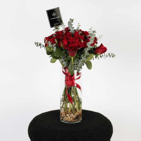 Elevate your romance with this timeless arrangement of deep red roses and fresh eucalyptus stems, elegantly displayed in a glass cylinder vase with decorative pebbles. Finished with a satin red bow, it’s a sophisticated choice for Valentine’s Day delivery anywhere in Amman.