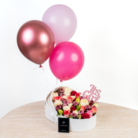 The set features a lush, vibrant mix of premium roses, delicate chrysanthemums, and fresh lilies in shades of cream, blush pink, and deep raspberry. To add to the celebration, it comes accompanied by a trio of high-quality helium balloons in coordinating pink and metallic rose gold tones.